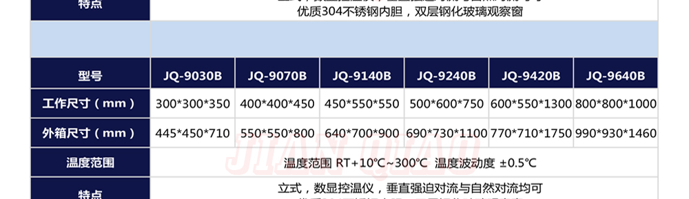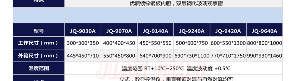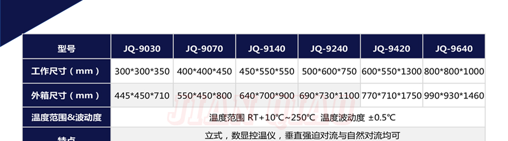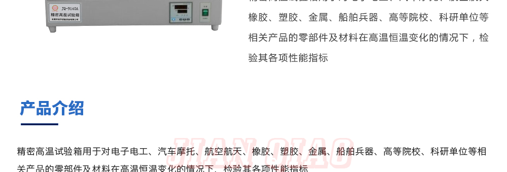 產品型號:JQ-9030 品牌:劍 喬 用途:精密高溫試驗箱用于對電子電工、汽車摩托、航空航天、橡膠、塑膠、金屬、船舶兵器、高等院校、科研單位等相關產品的零部件及材料在高溫恒溫變化的情況下,檢驗其各項性能指標咨詢熱線:13829135130