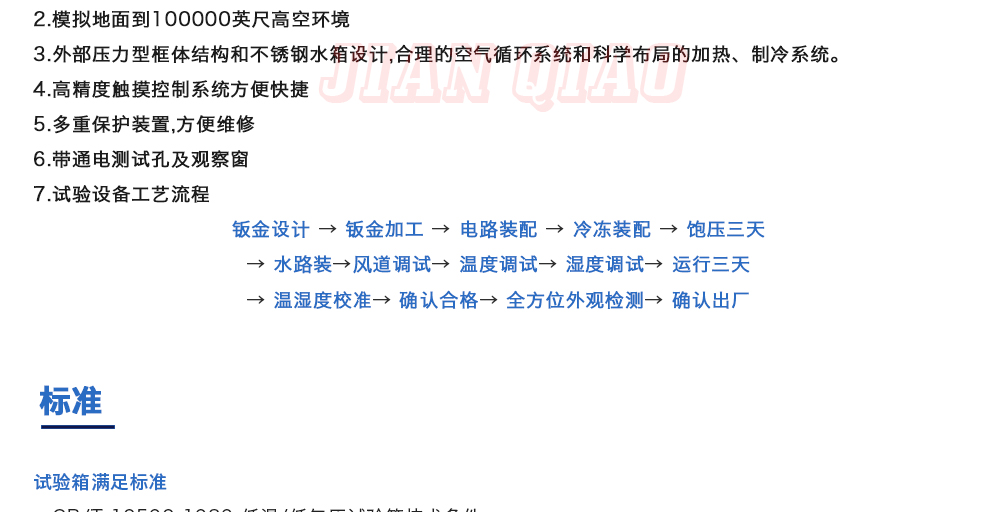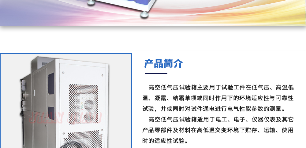 產品型號:JQTA-225 品牌:劍 喬 用途:高空低氣壓試驗箱主要用于試驗工件在低氣壓、高溫低溫、凝露、結霜單項或同時作用下的環境適應性與可靠性試驗,并或同時對試件通電進行電氣性能參數的測量。高空低氣壓試驗箱咨詢熱線:13829135130
