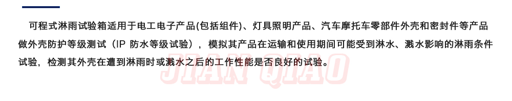 產品型號:IPX-1234 品牌:劍 喬 用途:可程式淋雨試驗箱適用于電工電子產品(包括組件)、燈具照明產品、汽車摩托車零部件外殼和密封件等產品做外殼防護等級測試(IP 防水等級試驗),模擬其產品在運輸和使用期間可能受咨詢熱線:13829135130