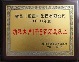 由廈門市湖里區(qū)政府舉辦的 “湖里區(qū)2010年度納稅先進企業(yè)”的評選名單已經(jīng)正式揭曉,鷺燕(福建)集團有限公司榜上有名,獲得了 “湖里區(qū)2010年度納稅大戶1千5百萬元以上先進企業(yè)”的榮譽稱號。自2007年底搬遷至湖里區(qū)以來,我司已連續(xù)三年獲此榮譽稱號。