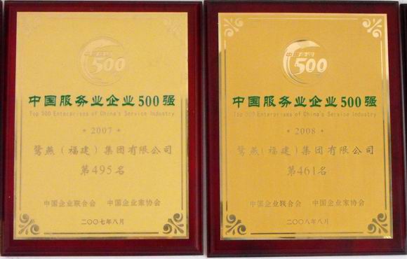鷺燕集團(tuán)又傳捷報,在榮獲了“市百強企業(yè)”、“市重點民營企業(yè)”、“湖里區(qū)十佳文明企業(yè)”之后,再次榮獲“中國服務(wù)企業(yè)500強”稱號,這已是鷺燕集團(tuán)連續(xù)三年獲此殊榮。
