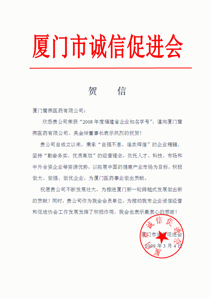 廈門市誠信促進(jìn)會賀信