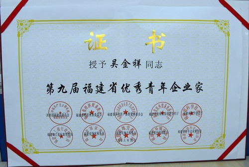 [喜訊] 日前,由共青團(tuán)福建省委員會(huì)、福建省經(jīng)濟(jì)貿(mào)易委員會(huì)、福建省國(guó)有資產(chǎn)監(jiān)督管理委員會(huì)、福建省對(duì)外貿(mào)易經(jīng)濟(jì)合作廳、福建省科學(xué)技術(shù)廳、福建省工商行政管理局、福建省國(guó)家稅務(wù)局、福建省地方稅務(wù)局、福建省環(huán)境保護(hù)局、福建省青年企業(yè)家協(xié)會(huì)共同主辦的“第九屆福建省優(yōu)秀青年企業(yè)家”評(píng)選活動(dòng)揭曉,鷺燕集團(tuán)董事長(zhǎng)兼總裁---吳金祥先生榮獲“福建省優(yōu)秀青年企業(yè)家”榮譽(yù)稱號(hào)!