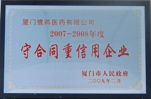 近日,廈門鷺燕醫(yī)藥有限公司、廈門鷺燕大藥房有限公司在廈門市工商行政管理局組織的 “廈門市2007—2008年度‘守合同,重信用’”評比活動(dòng)中榜上有名,這是鷺燕集團(tuán)旗下子公司繼05-06年度之后再次獲此殊榮。