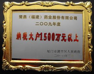 2010年3月23日,廈門湖里區(qū)人民政府召開2009年度納稅先進企業(yè)表彰大會,并公布2009年度納稅先進企業(yè)名單,鷺燕集團核心成員企業(yè)鷺燕(福建)藥業(yè)股份有限公司光榮登榜。自2006年以來鷺燕集團已連續(xù)四年獲得納稅大戶(1000萬以上)榮譽稱號。