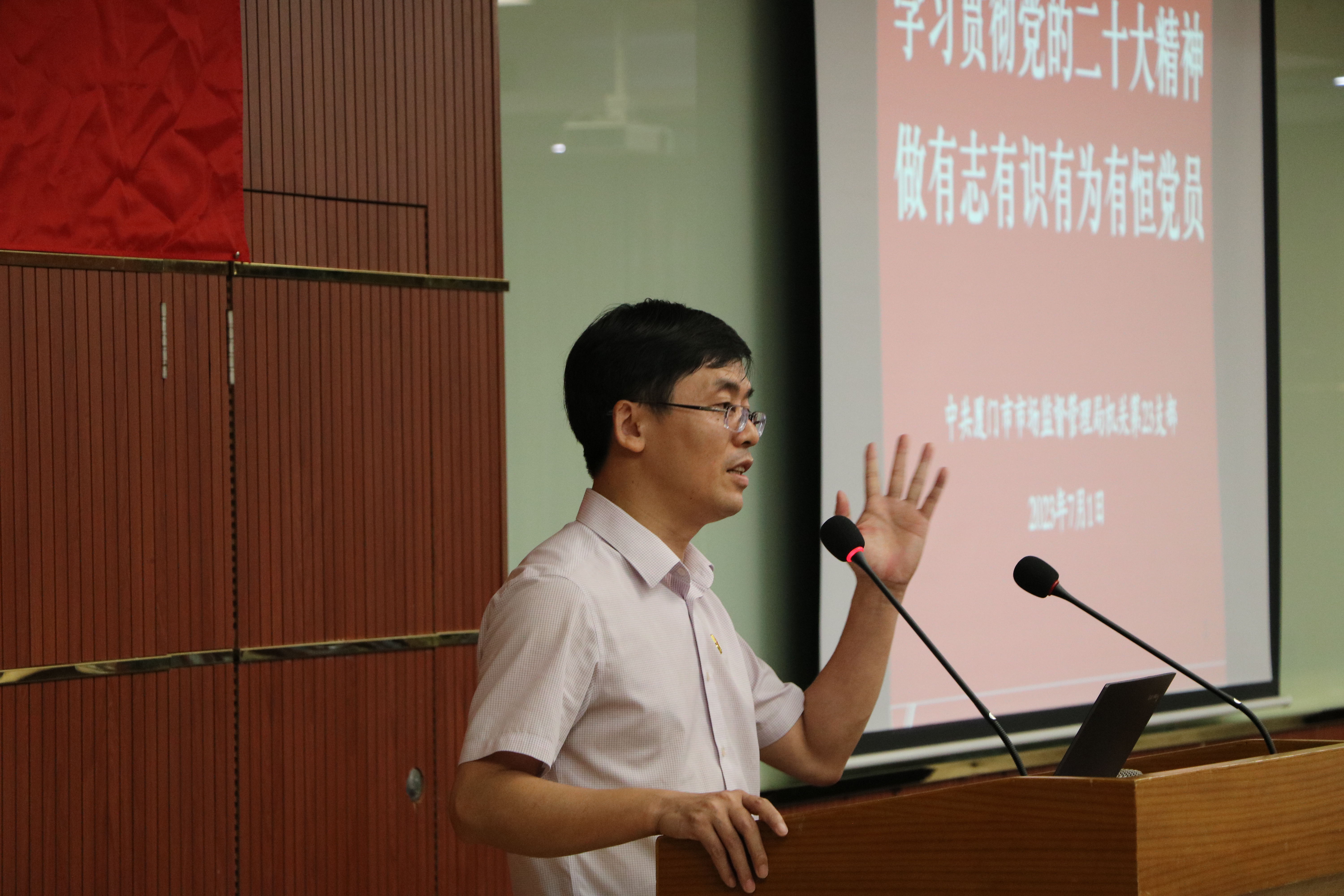 在這次聯(lián)建共建中,中共廈門市市場監(jiān)督管理局機關(guān)第二十三支部何清杭書記帶來了一堂《學(xué)習(xí)貫徹黨的二十大精神,做有志有識有為有恒黨員》的主題黨課。授課前,何書記作為領(lǐng)誓員,脫稿帶領(lǐng)大家一起重溫入黨誓詞,全體黨員面對鮮紅的黨旗,莊嚴(yán)地舉起右拳,鏗鏘有力、擲地有聲地宣讀誓詞。