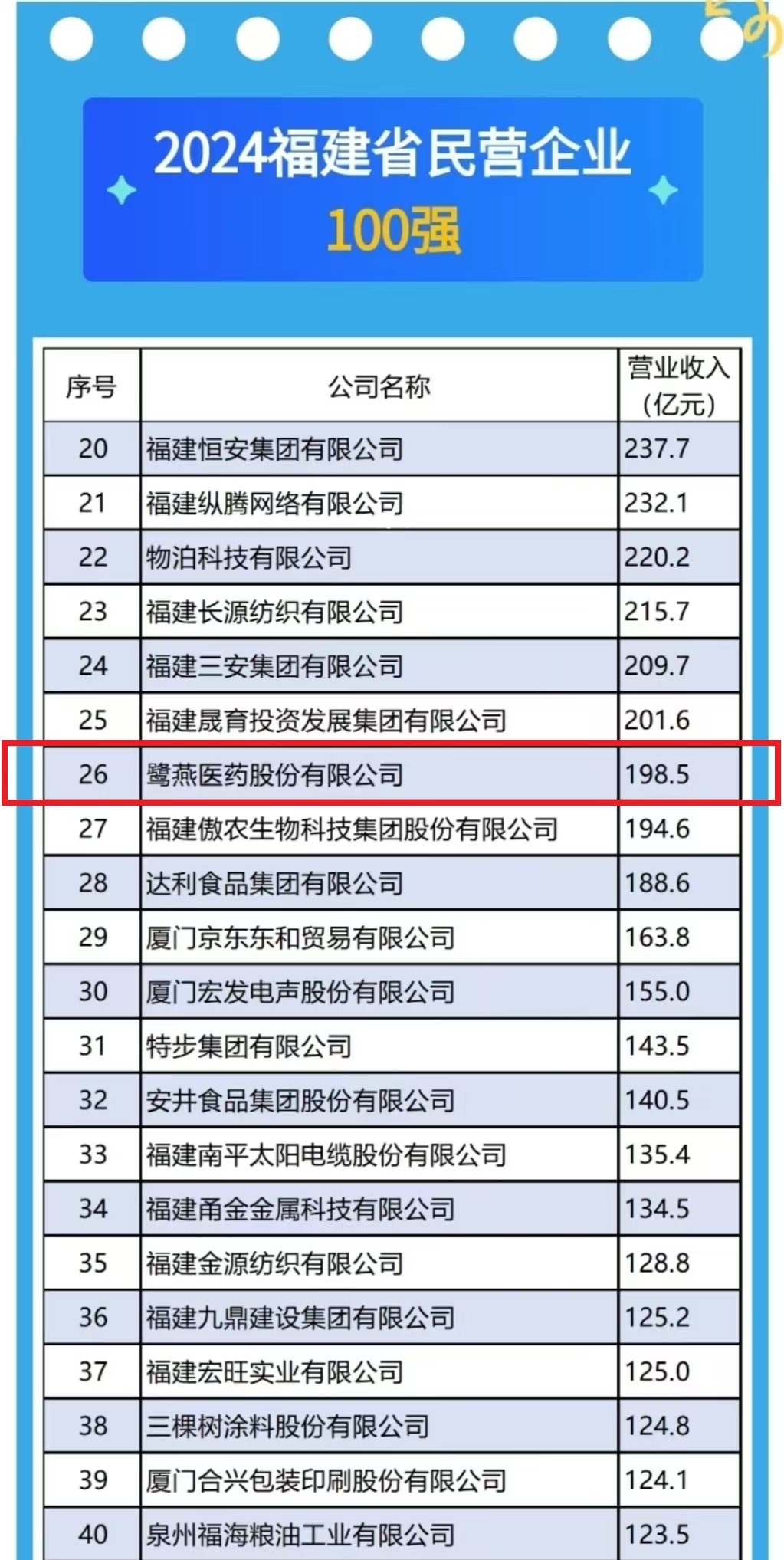 本月,福建省工商聯(lián)發(fā)布2024福建省民營企業(yè)100強(qiáng)、制造業(yè)民營企業(yè)100強(qiáng)、服務(wù)業(yè)民營企業(yè)100強(qiáng)、創(chuàng)新型民營企業(yè)100強(qiáng)和民營企業(yè)社會責(zé)任100佳5個榜單。鷺燕醫(yī)藥榮獲2024福建省民營企業(yè)100強(qiáng)第26位、福建省服務(wù)業(yè)民營企業(yè)100強(qiáng)第10位、福建民營企業(yè)社會責(zé)任100佳!