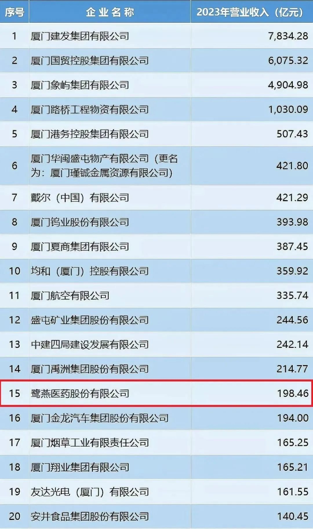 2024年11月,廈門企業(yè)和企業(yè)家聯(lián)合會(huì)發(fā)布2024廈門企業(yè)百?gòu)?qiáng)榜單,鷺燕醫(yī)藥股份有限公司榮列第15位!