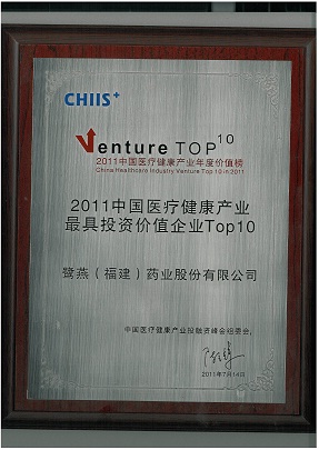 鷺燕(福建)藥業(yè)股份有限公司榮獲“2011中國醫(yī)療健康產(chǎn)業(yè)最具投資價(jià)值企業(yè)Top10”稱號(hào)