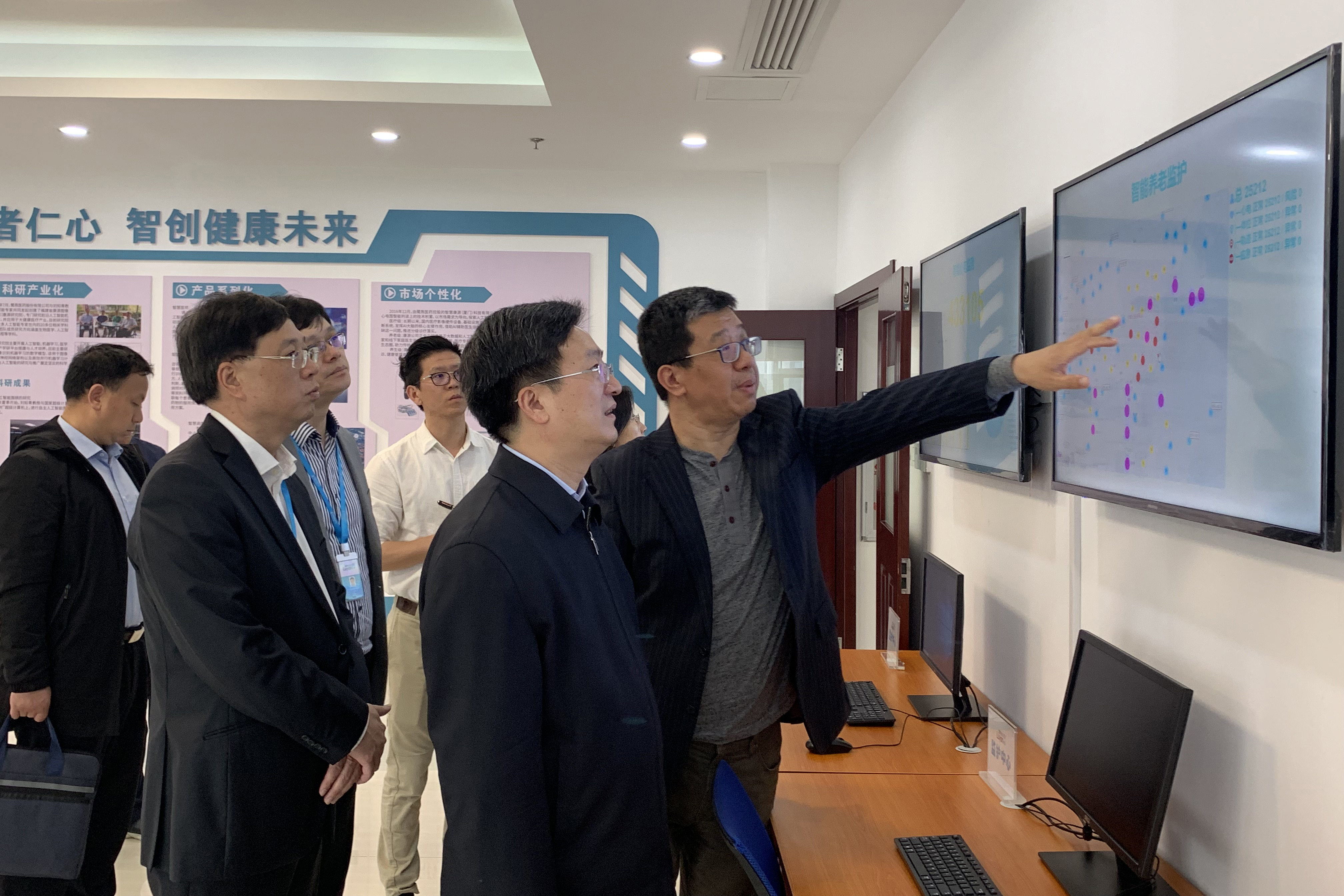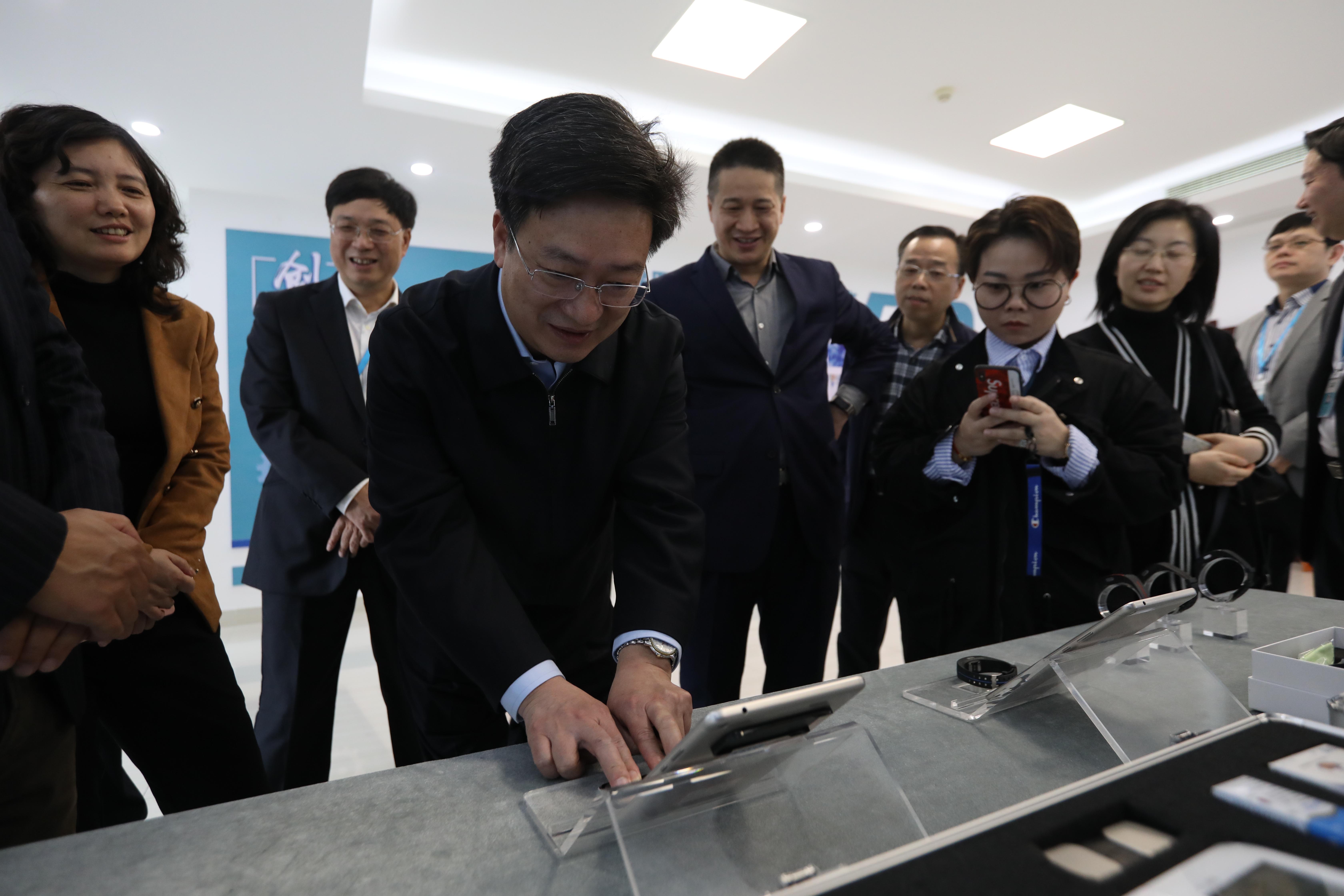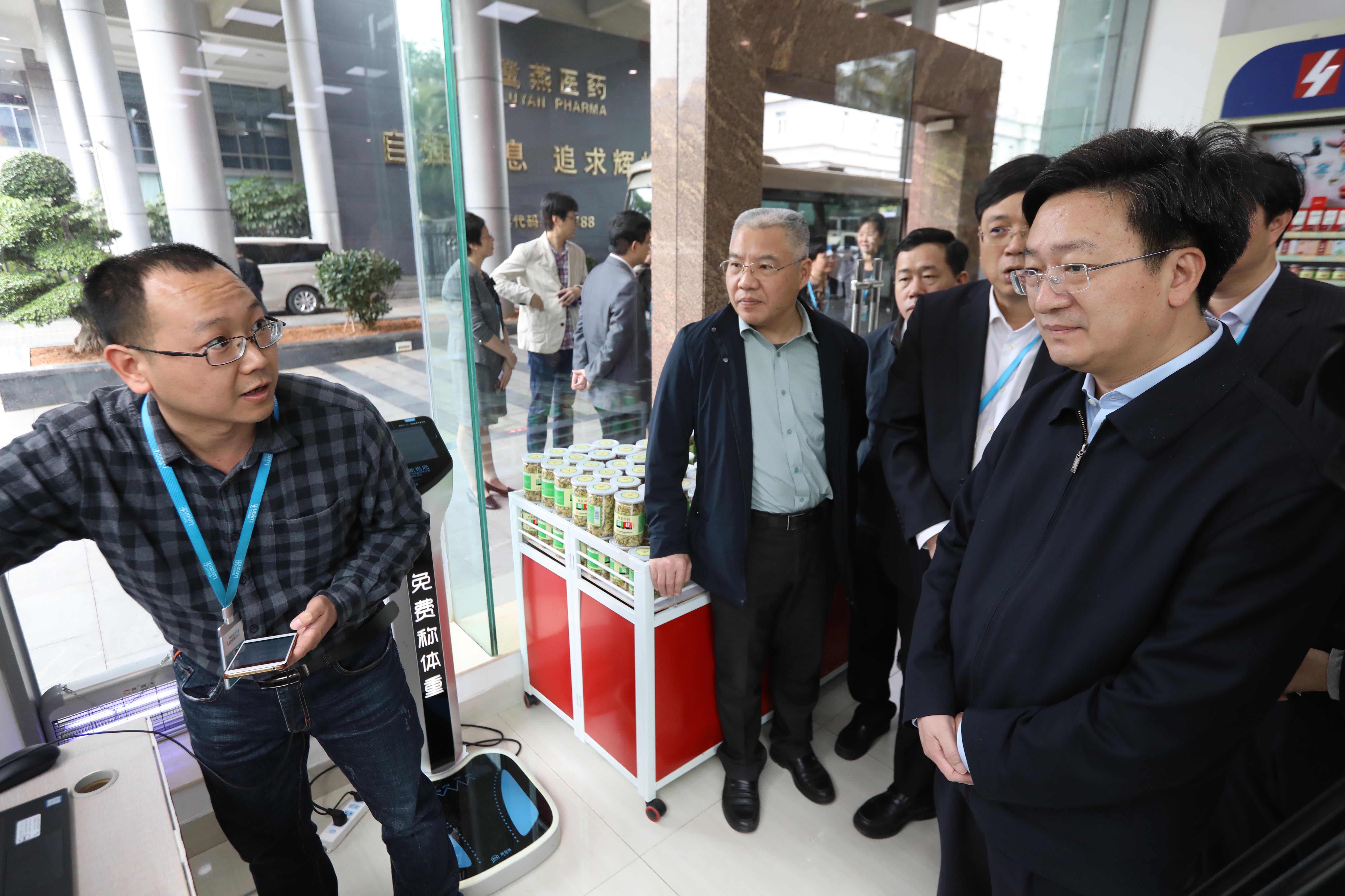 隨后,施副局長一行參觀了鷺燕醫(yī)藥人工智能產(chǎn)品體驗(yàn)館,鷺燕醫(yī)藥首席科學(xué)家劉知青教授重點(diǎn)介紹了鷺燕醫(yī)藥人工智能技術(shù)在醫(yī)療領(lǐng)域的創(chuàng)新應(yīng)用,施副局長親自體驗(yàn)了鷺燕醫(yī)藥旗下智慧康源科技公司推出的智能心電檢測計(jì)。