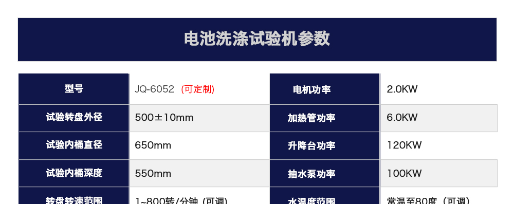 產(chǎn)品型號:JQ-6052 品牌:劍 喬 用途:電池洗滌試驗(yàn)機(jī),本實(shí)用新型涉及電池試驗(yàn)設(shè)備技術(shù)領(lǐng)域,特指一種電池洗滌試驗(yàn)機(jī),架體設(shè)有測試箱體,測試箱體的下部設(shè)有洗滌箱,測試箱體內(nèi)設(shè)有轉(zhuǎn)動槳,測試箱體內(nèi)側(cè)面設(shè)有烘咨詢熱線:13829135130