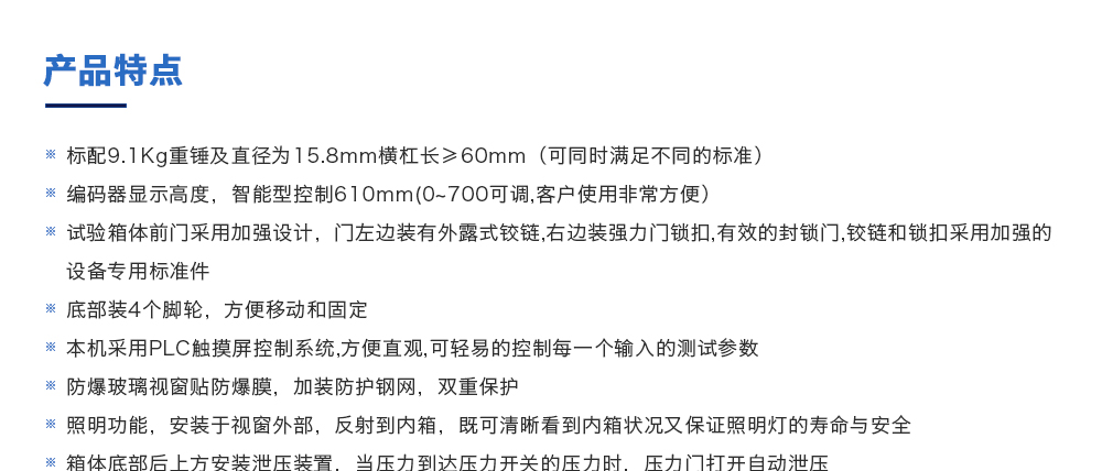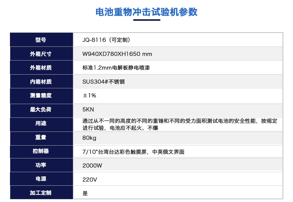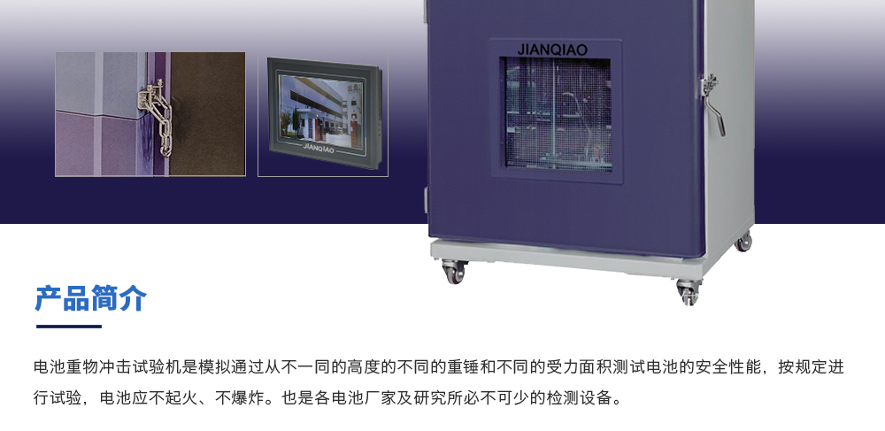 產品型號:JQ-8116(定制款) 品牌:劍 喬 用途:電池重物沖擊試驗機是模擬通過從不一同的高度的不同的重錘和不同的受力面積測試電池的安全性能,按規(guī)定進行試驗,電池應不起火、不爆炸。也是各電池廠家及研究所必不可少的檢咨詢熱線:13829135130