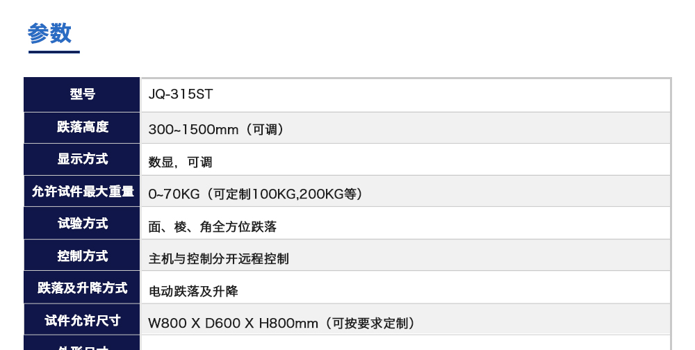 產(chǎn)品型號(hào):JQ-315ST 品牌:劍 喬 用途:動(dòng)力電池跌落試驗(yàn)機(jī)主要用于評(píng)估各類(lèi)鋰電池及鎳電池等其他一次電池,二次電池,蓄電池單體或電池組自由跌落(例如從臺(tái)面頂部)的安全性能。電池以不爆炸不起火為合格。咨詢(xún)熱線:13829135130