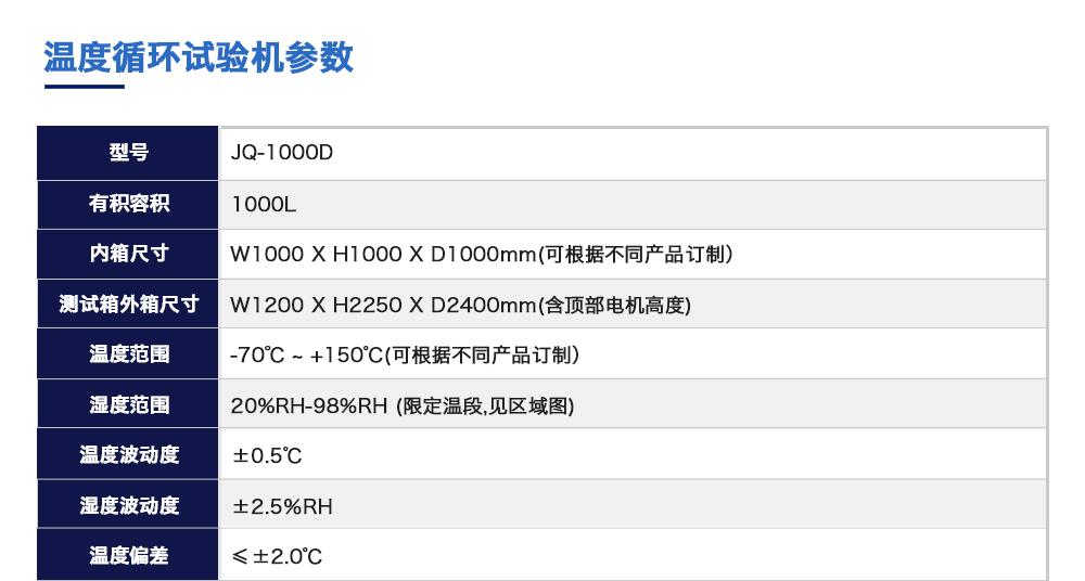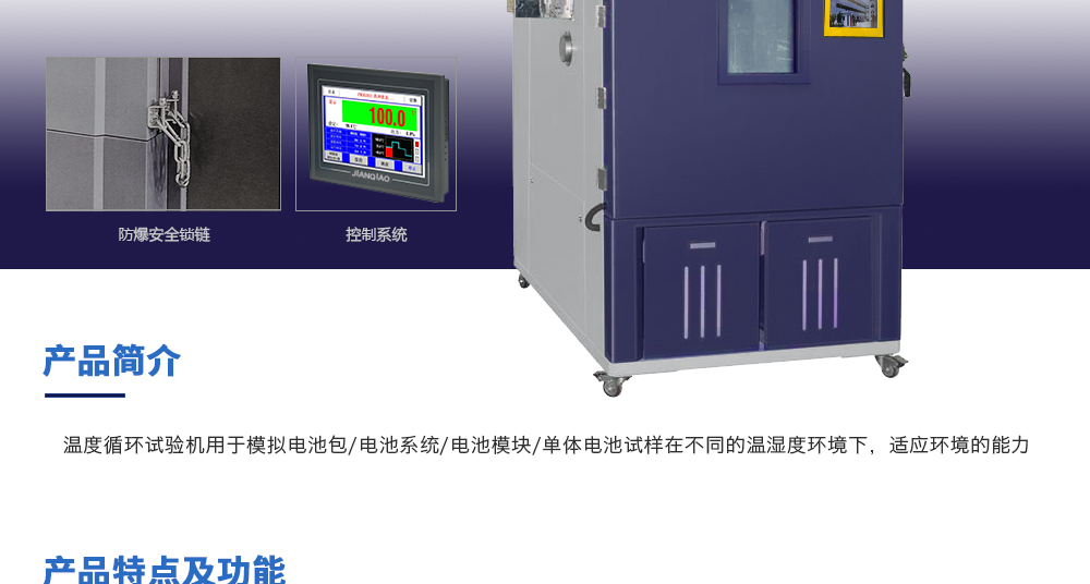 產(chǎn)品型號:JQ-1000D 品牌:劍 喬 用途:溫度循環(huán)試驗機(jī)用于模擬電池包/電池系統(tǒng)/電池模塊/單體電池試樣在不同的溫濕度環(huán)境下,適應(yīng)環(huán)境的能力咨詢熱線:13829135130