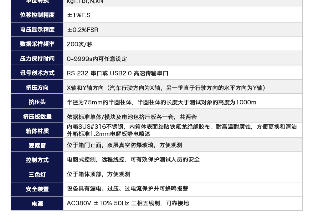 產(chǎn)品型號(hào):JQ-5067-AL20 品牌:劍 喬 用途:電池包擠壓試驗(yàn)機(jī)模擬各類動(dòng)力動(dòng)力電池包和系統(tǒng)在運(yùn)輸、儲(chǔ)存及使用過(guò)程中電池包遭受碰撞擠壓的情形,人工呈現(xiàn)電池在遭受擠壓時(shí)可能出現(xiàn)的不同狀況。咨詢熱線:13829135130