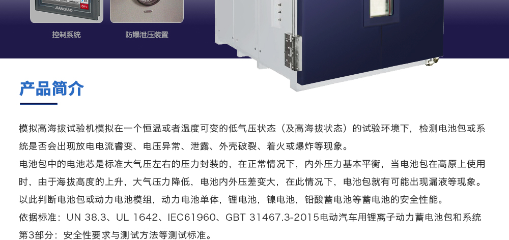 產(chǎn)品型號(hào):JQ-8203-5㎡ (定制款) 品牌:劍 喬 用途:模擬高海拔試驗(yàn)機(jī)模擬在一個(gè)恒溫或者溫度可變的低氣壓狀態(tài)(及高海拔狀態(tài))的試驗(yàn)環(huán)境下,檢測(cè)電池包或系統(tǒng)是否會(huì)出現(xiàn)放電電流睿變、電壓異常、泄露、外殼破裂、著火或爆炸等咨詢(xún)熱線:13829135130