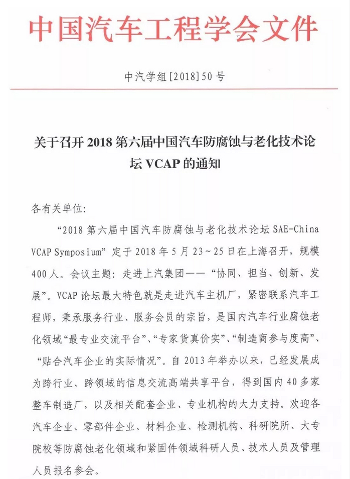 “2018第六屆中國(guó)汽車(chē)防腐蝕與老化技術(shù)論壇SAE-China VCAP Symposium”定于2018年5月23~25日在上海召開(kāi),規(guī)模400人。