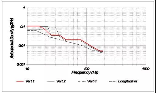 SAE J2380標準振動目標譜基于實際道路測量數據,旨在模擬行駛10萬英里對電池組和模塊的影響。該標準要求一系列隨機振動目標譜應用于三個垂直軸,試驗時長從9分鐘到38小時不等。