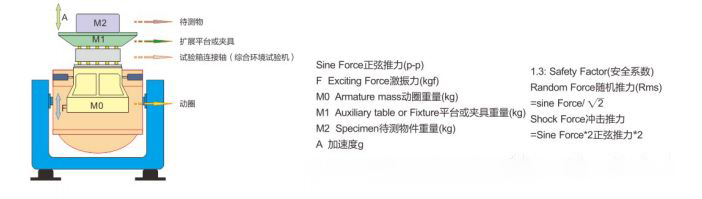 由于三軸電磁振動臺的主參數(shù)是以激振力大小命名與排序的,根據(jù)已知的參數(shù),利用∑ m x a= ( m1 + m2 + m3 + m4) x a計算出激振力的大小,并加1.3安全系數(shù),便能確定在加速度區(qū)域所需的激振力的大小,并以此作為選定相應(yīng)型號的依據(jù)。
