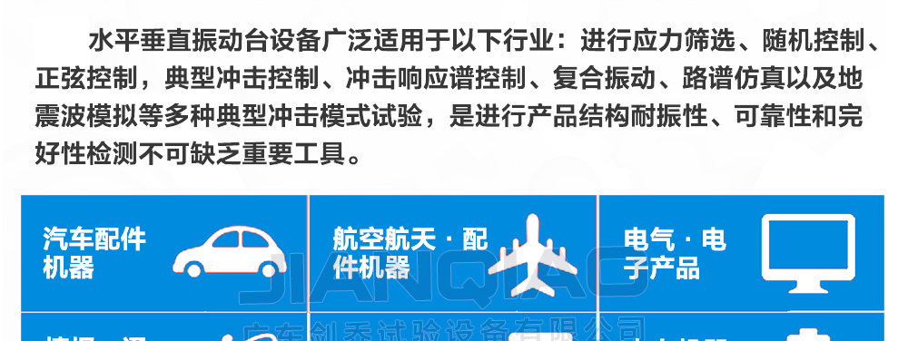產品型號:JQA-102-240 品牌:劍 喬 用途:該水平垂直振動臺可模擬再現正弦、隨機、諧振搜尋與駐留、典型沖擊和道路仿真等模式,符合:(MIL-STD,DIN,ISO,ASTM,IEC,ISTA,GB,GJB,JIS,BS等國家及國際測試標準)咨詢熱線:13829135130