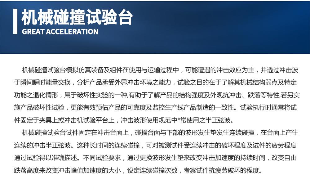 產(chǎn)品型號:JQJ-100 品牌:劍 喬 用途:機(jī)械碰撞試驗(yàn)臺模擬仿真裝備及組件在使用與運(yùn)輸過程中,可能遭遇的沖擊效應(yīng)為主,并透過沖擊波于瞬間瞬時(shí)能量交換,分析產(chǎn)品承受外界沖擊環(huán)境之能力,試驗(yàn)之目的在于了解其機(jī)咨詢熱線:13829135130